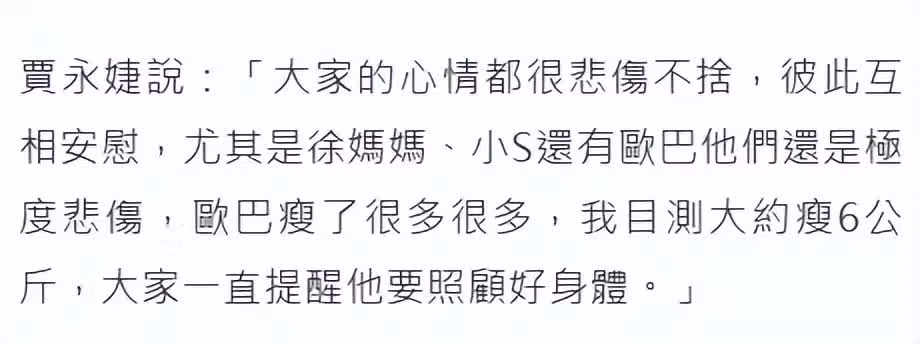 好友賈永婕2月14日接受採訪證實此事,回憶昨天的情況表示「大家的心情都很悲傷不舍,彼此互相安慰,尤其是徐媽媽、小S還有歐巴他們還是極度悲傷,歐巴瘦了很多很多,我目測大約瘦6公斤,大家一直提醒他要照顧好身體。」