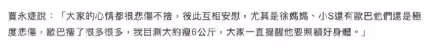 此外,賈永婕還提到了大S家屬的情況,她說S媽、小S、具俊曄極度悲傷,她還目測具俊曄瘦了12斤,大家都提醒他要注意身體。