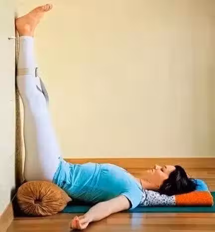 仰面躺著,把腿伸到牆上,放鬆手臂。