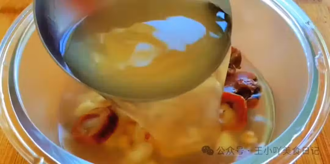 5、享用時刻:關火後,稍等片刻,讓茶湯稍微冷卻,即可享用。這道茯苓山楂薏米茶,口感微酸中帶著一絲焦香,既可連同食材一同食用,也可只飲湯汁。