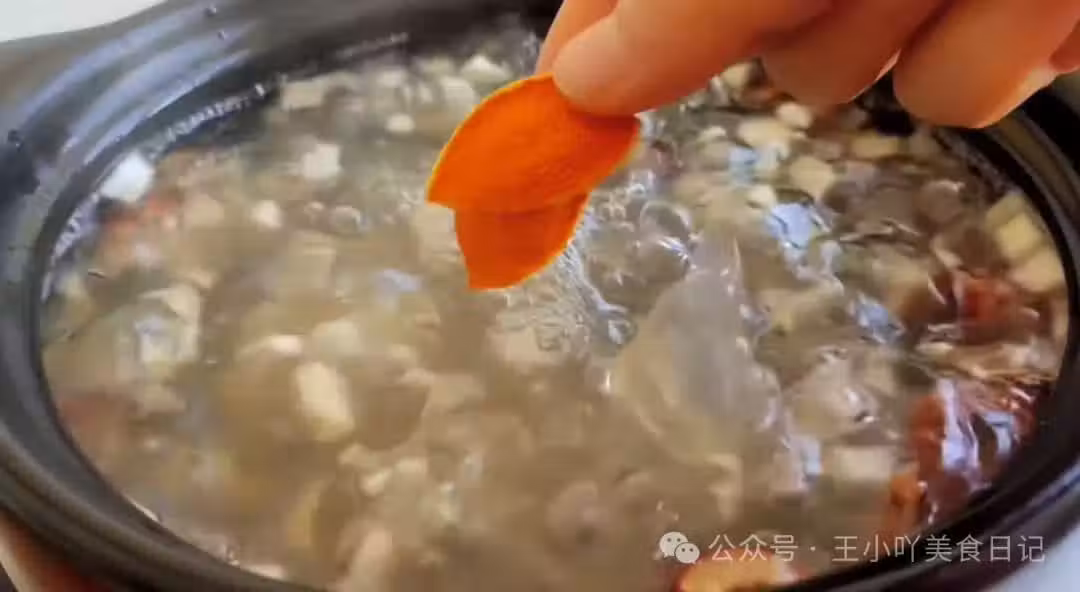 待水沸騰後,轉中小火繼續煮制,此時加入已清洗乾淨的山楂乾和陳皮。陳皮能增香理氣,與山楂相得益彰。