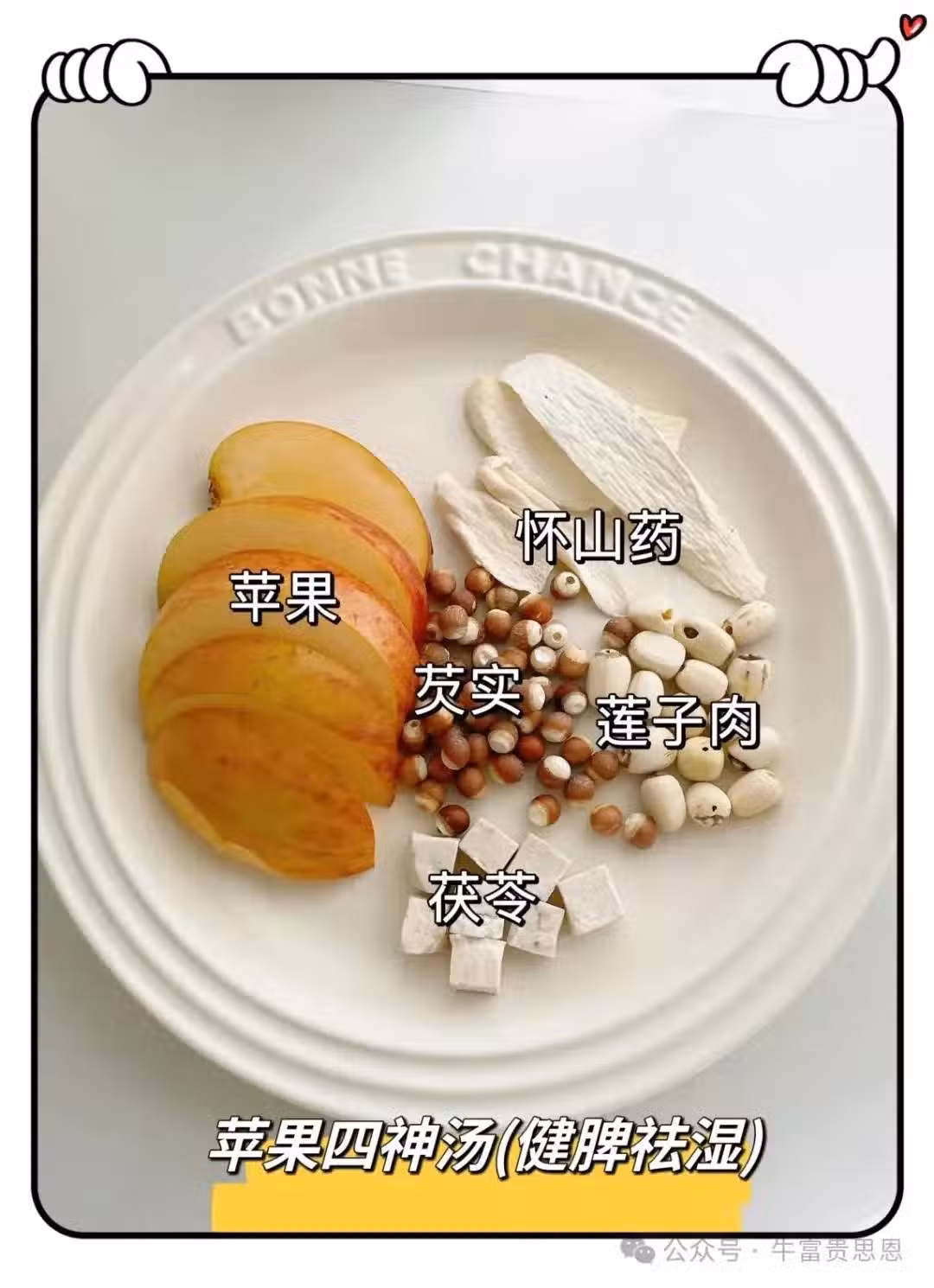 想要健脾祛濕,調理身體?這款蘋果四神湯是你的不二選擇!蘋果與懷山藥、芡實、蓮子肉、茯苓的完美搭配,不僅味道清甜,還能幫助你健脾祛濕,輕鬆調理身體!