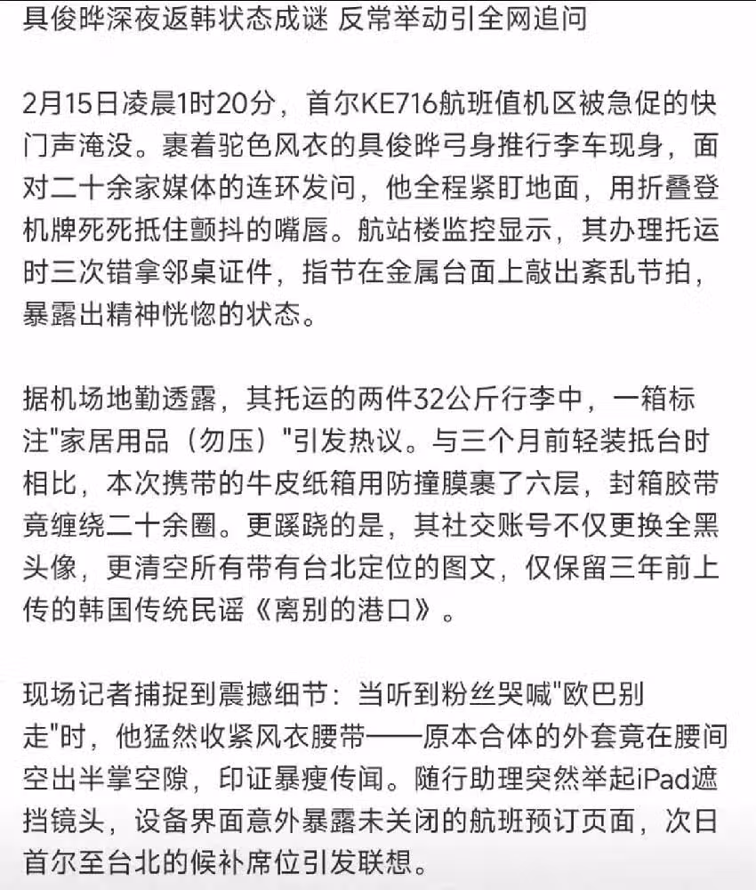 具俊曄也沒想到機場會有二十多家媒體的蹲守,看到媒體拍自己,他就低著頭全程一言不發,但媒體卻發現具俊曄的狀態非常不對勁,不知道是不是傷心過度的原因,他的嘴唇發白,且一直顫抖,期間還用登機牌擋住自己的嘴唇。