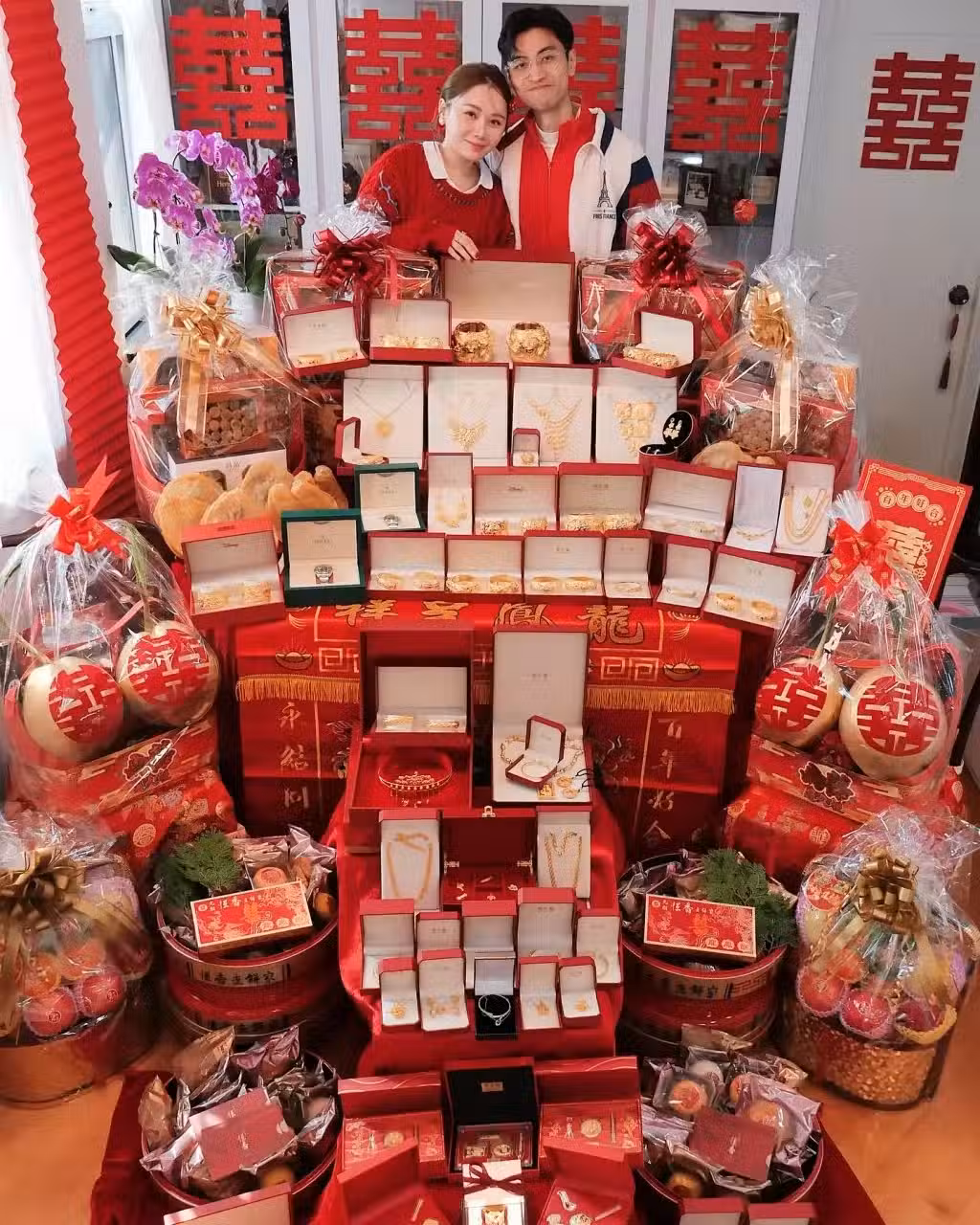單是龍鳳手鐲已有十多對,其餘大大小小金器如金豬牌、項鍊等更放滿桌上甚至地下,還有兩隻名表,其餘海味、水果、禮餅、椰子等等堆放在廳上,幾乎放出門口,一眾親友都寸步難行,排場超級誇張。