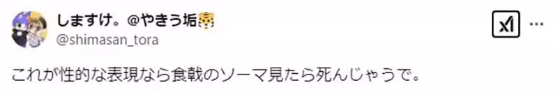 「我看到有人說這個動畫廣告很情色,那我也抱著炎上的覺悟來說句話。我看著老派美食漫畫長大,都知道臉紅只是標配,絲毫沒有從中感受到任何性暗示。我甚至還會想說,到底什麼時候要爆衣,或是從口中射出光束呢。」