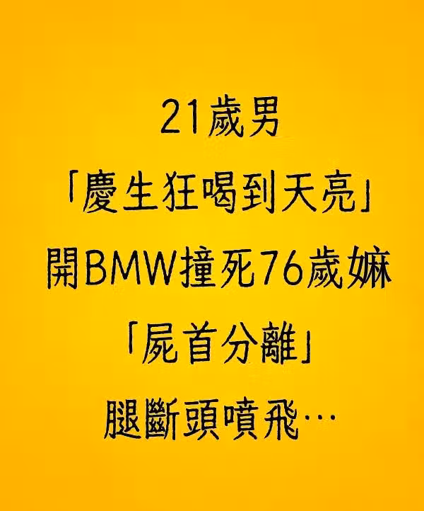 21歲男「慶生狂喝到天亮」開BMW撞死76歲老婦「屍首分離」腿斷頭噴飛……