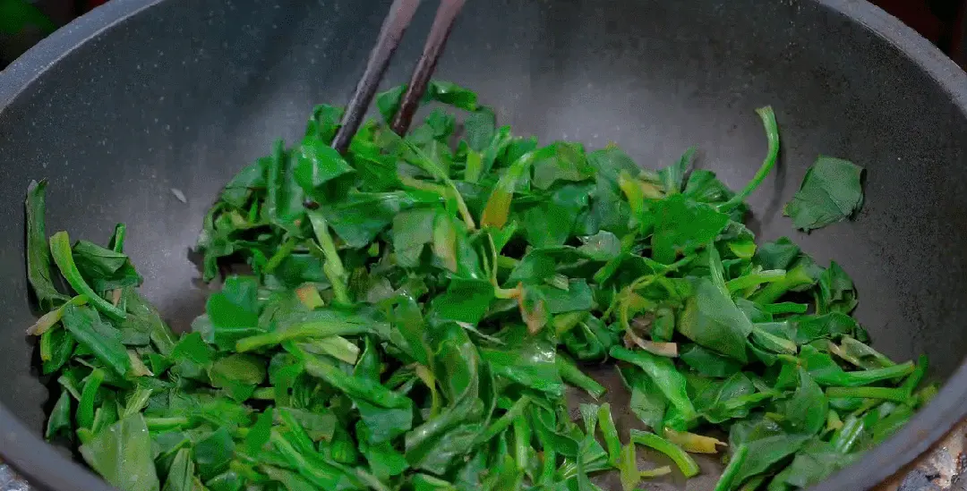 由於車前草含水量高,需先炒幹部分水分,以免與薑絲同炒時薑絲過早炒糊。