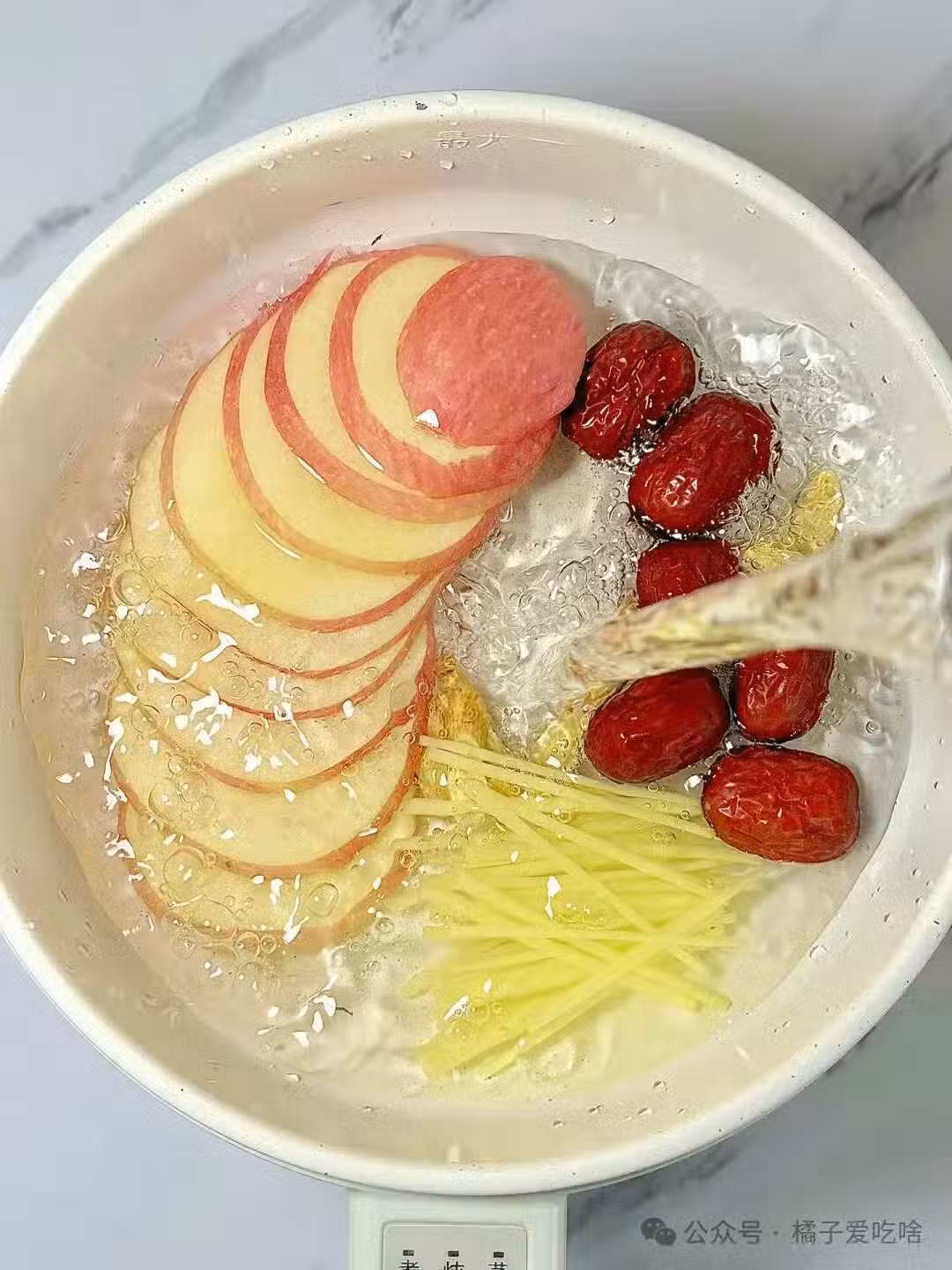 2. 煮制:將切好的生薑片和蘋果塊放入鍋中,加入適量的水,大火煮開後轉小火煮15-20分鐘左右,至蘋果軟爛。