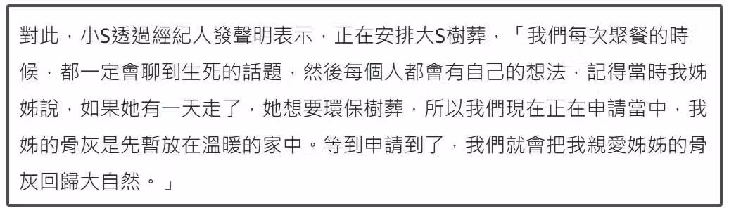 而小S安排大S樹葬的消息早就被媒體曝光,甚至都提交了申請,具俊曄就好像是剛通網一樣,大S都準備要下葬了,他才出面反對樹葬。那之前商量樹葬的時候,具俊曄是沒聽懂還是沒人告知他呢?