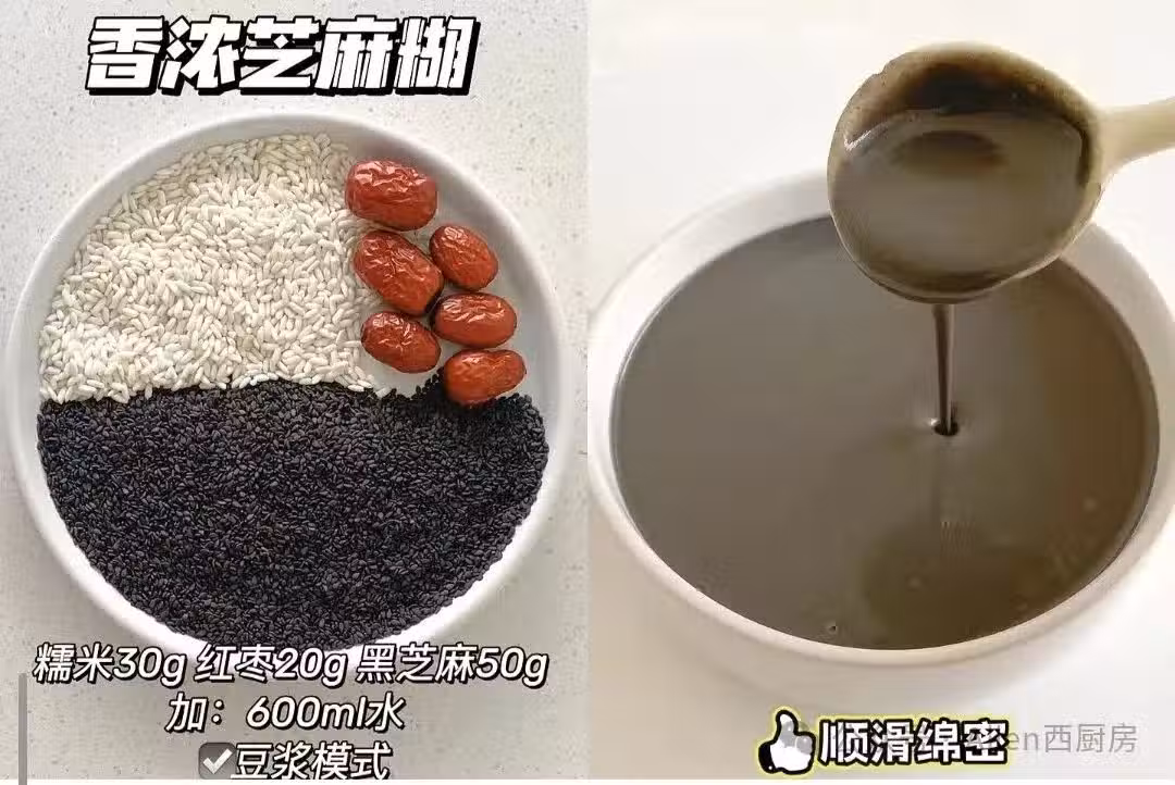 - 功效:黑芝麻富含蛋白質、維生素E、鐵等,有補肝腎、益精血、烏鬚髮的作用;紅棗能補中益氣、養血安神;糯米可健脾暖胃。此芝麻糊適合氣血不足、肝腎虧虛、頭髮早白及脾胃虛寒者食用,能滋養身體、改善氣色。