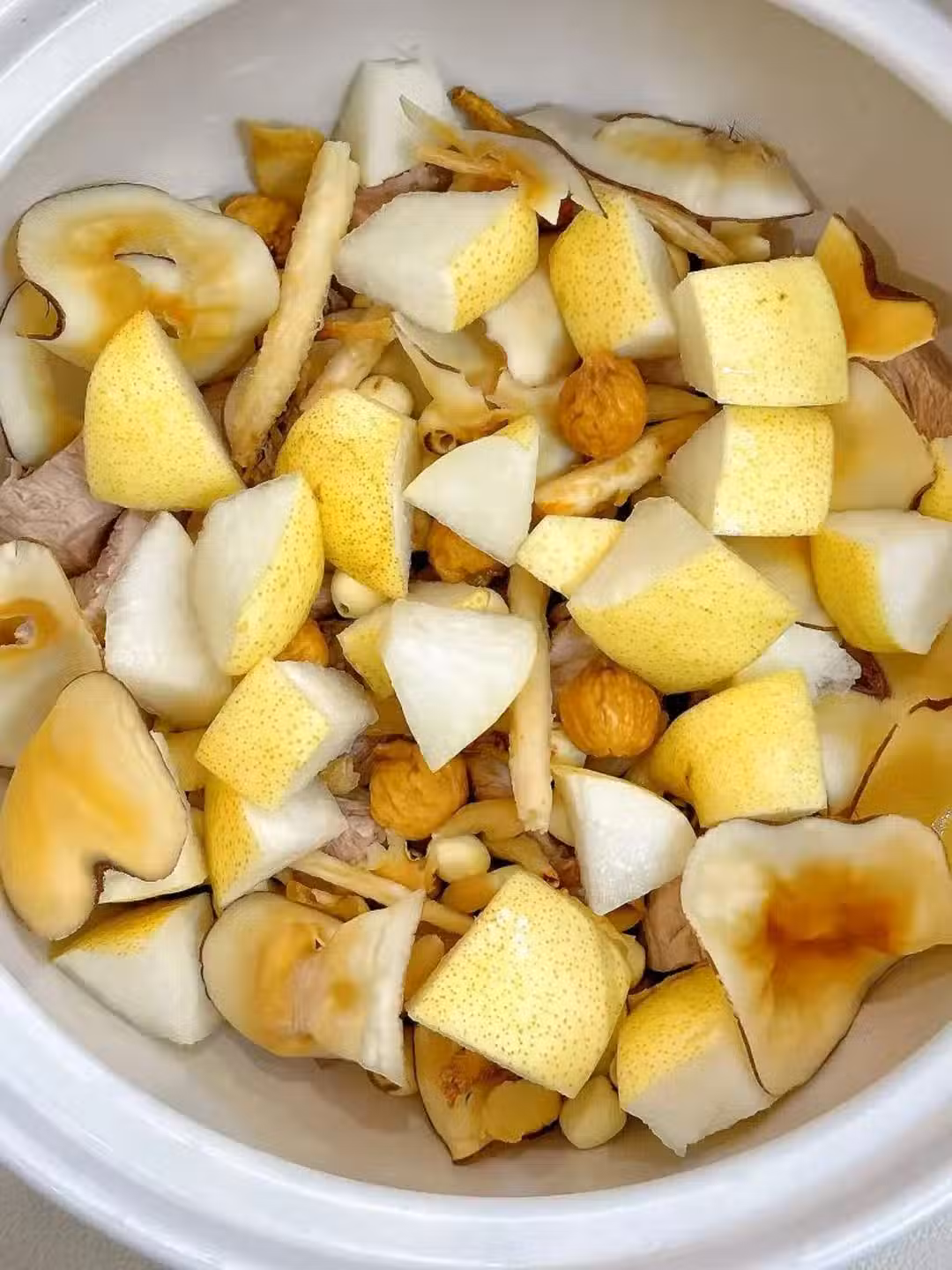 1️⃣瘦肉洗凈焯水備用,雪梨一個用鹽搓洗乾淨,去芯切塊;