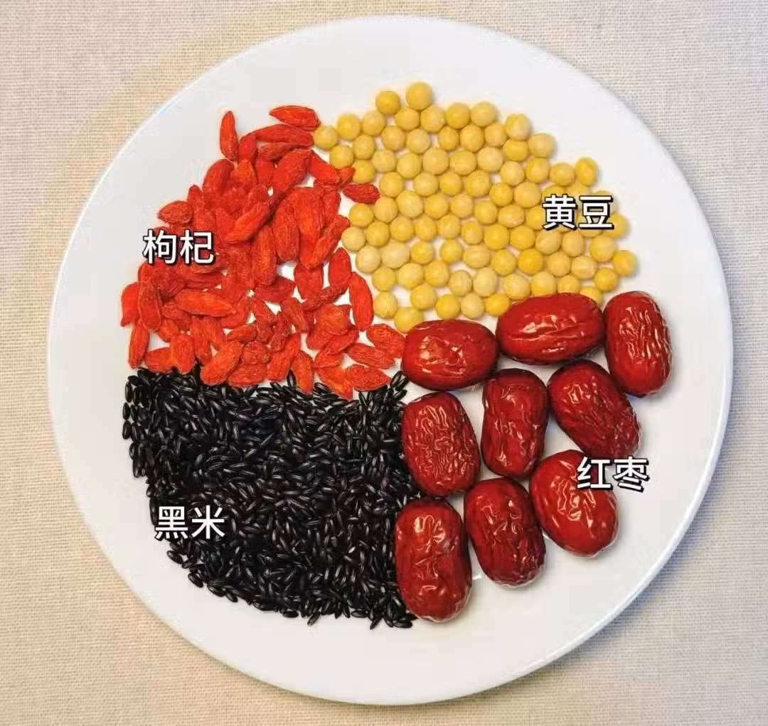 食材:黃豆 35g | 黑米 25g | 枸杞 8g | 紅棗 3顆
