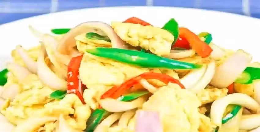 3,另起鍋添油,倒入青紅辣椒翻炒幾下,放入洋蔥,快速翻炒片刻。