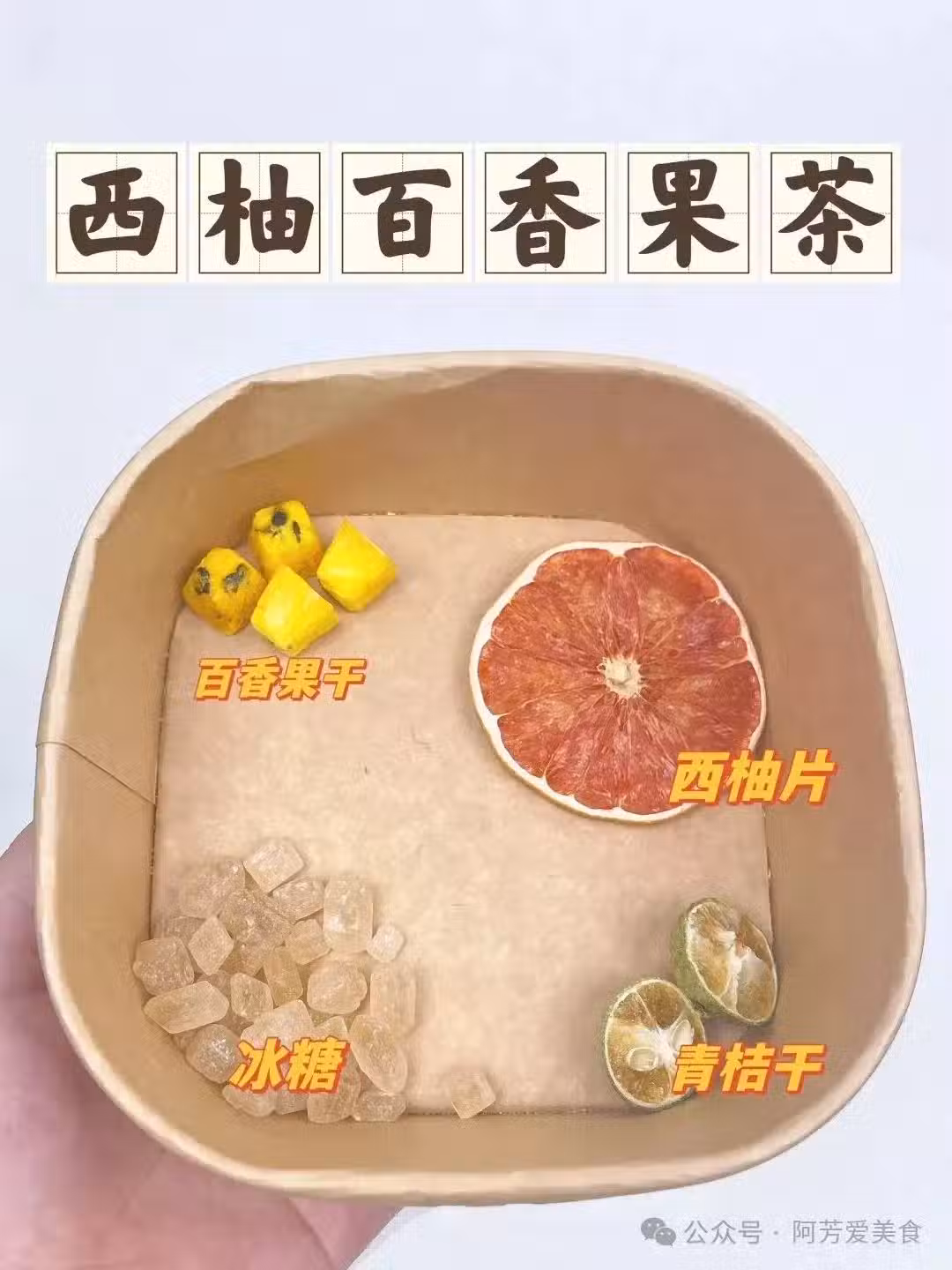 西柚百香果茶,,西柚的微苦和金桔的清涼爽口,再搭配百香果乾,不僅好喝還清爽,很是適合日常喝。