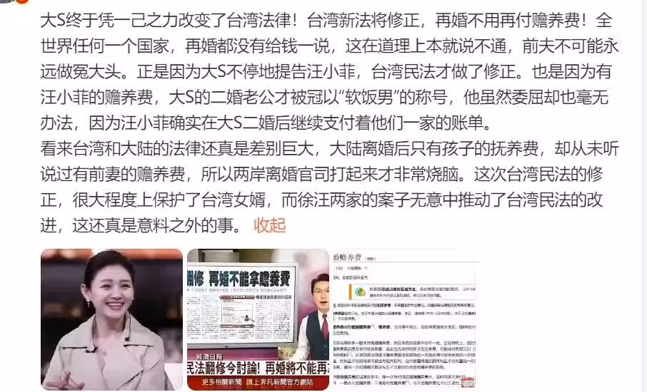 不過,若大陸籍子女繼承遺產,可能面臨200萬新台幣的上限限制。這一條款被質疑「歧視大陸籍」,但台灣內政部門辯稱,此舉是為防止「洗錢」和「財產轉移」。大S的離世與法律修法的熱議,恰似一面鏡子,映照出台灣社會對女性權益的複雜態度。一方面,修法體現了對女性經濟獨立的重視:再婚免付贍養費,本質是承認女性有權選擇自己的生活方式,而非被前段婚姻束縛。另一方面,大S遺產分配中「大陸籍子女受限」條款,又暴露出法律對身份的隱性歧視。 這場修法背後,大S的公眾形象扮演了微妙角色。她與汪小菲的離婚鬧劇、對前夫的「手撕」行為,雖引發爭議,卻也讓公眾聚焦於婚姻中的經濟權益問題。
