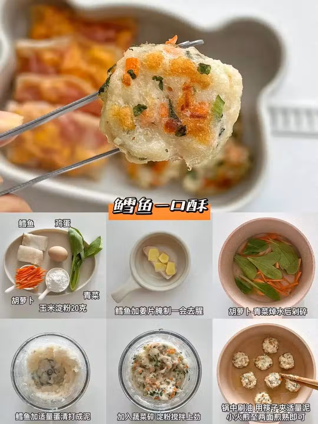 鱈魚一口酥:深海炸彈來襲,鱈魚剁泥加蛋清,蔬菜碎,澱粉攪拌上勁,搓成球,平底鍋刷油煎一煎。
