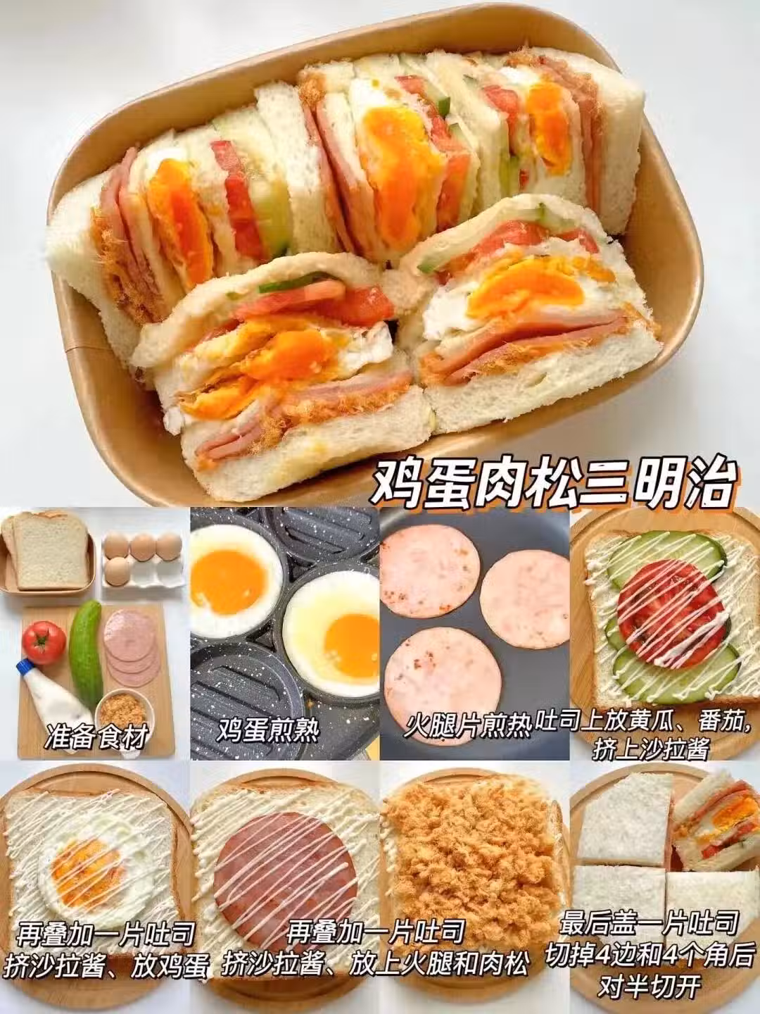 煮雞蛋壓碎拌沙拉醬,厚塗在吐司上狂撒肉鬆。