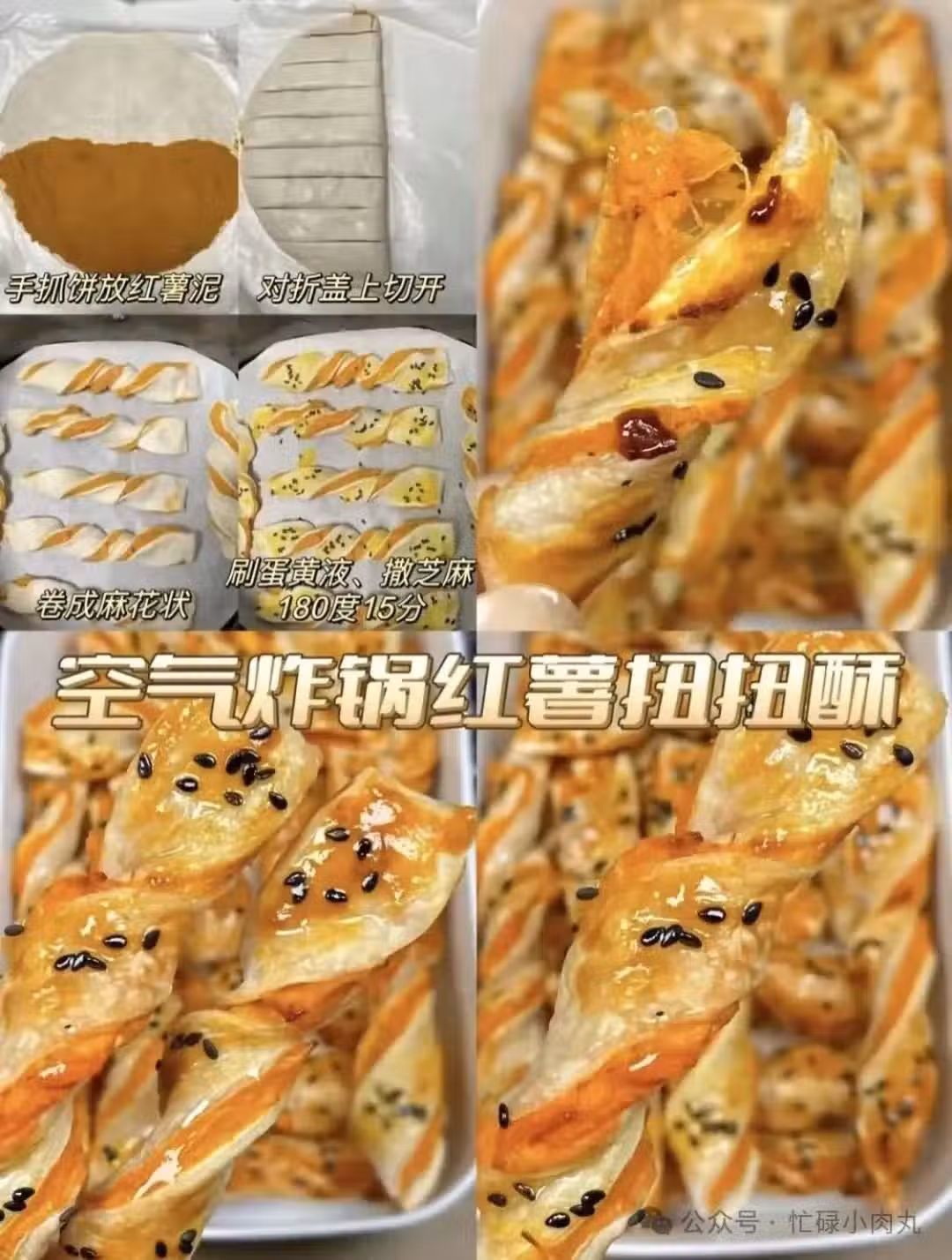 2⃣️愛吃餅的一定別錯過這道空氣炸鍋孜然土豆餅! 土豆煎至金黃,與炒香的火腿片做餡料,鋪在手抓餅上,摺疊好後刷上蛋黃液、撒上芝麻,180度烤15分鐘。外皮酥脆,內餡軟糯,孜然香味四溢,一口咬下去超滿足,做早餐或小吃都很棒 !