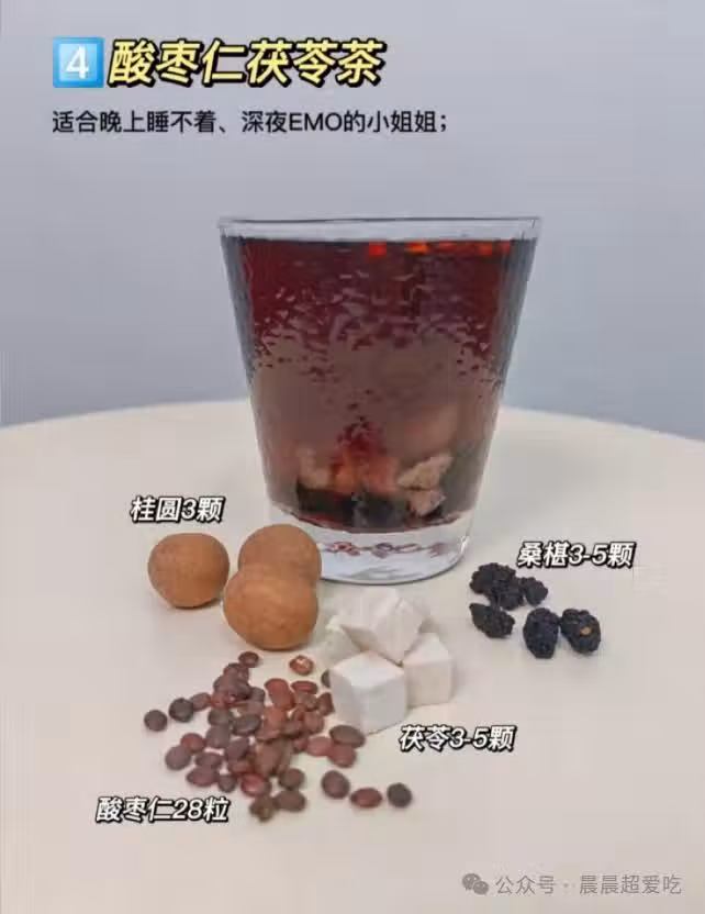 說明:酸棗仁寧心安神,桂圓養血安神,茯苓健脾寧心,桑葚也有一定的安神作用。如果方便的話本款用養生壺煮一下口感更佳哈。