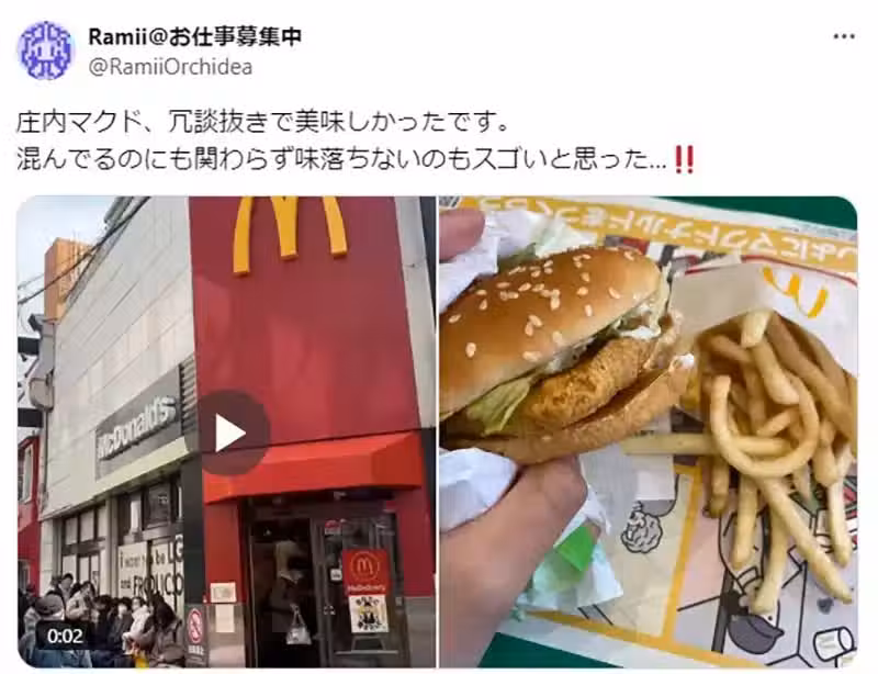 「我去吃了話題的莊內麥當勞。薯條有夠酥脆好吃。店裡看起來非常繁忙,店員卻依然保持著親切的態度,真的是一間好店!」