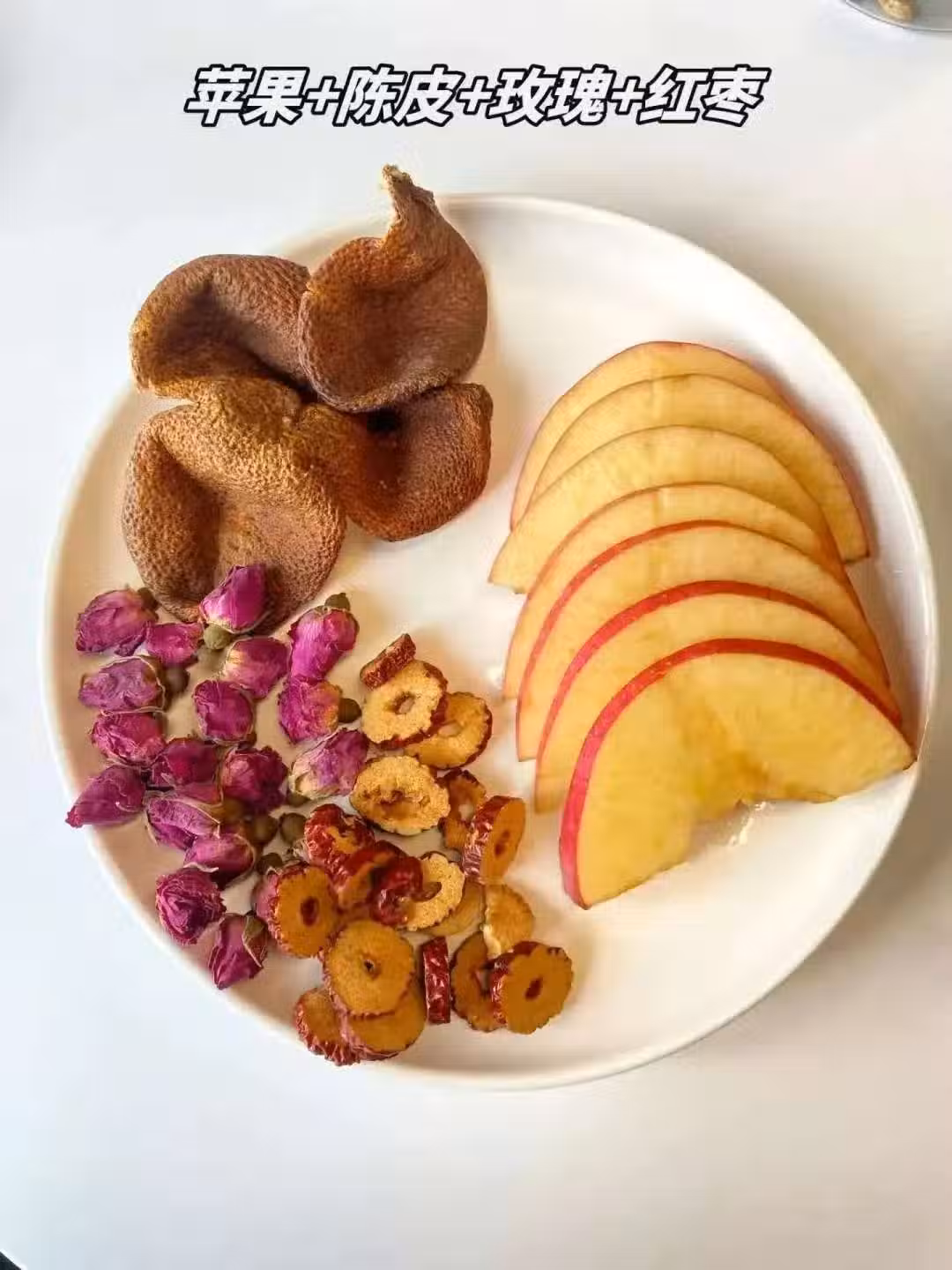 蘋果切片,陳皮、紅棗、玫瑰花茶各3克。