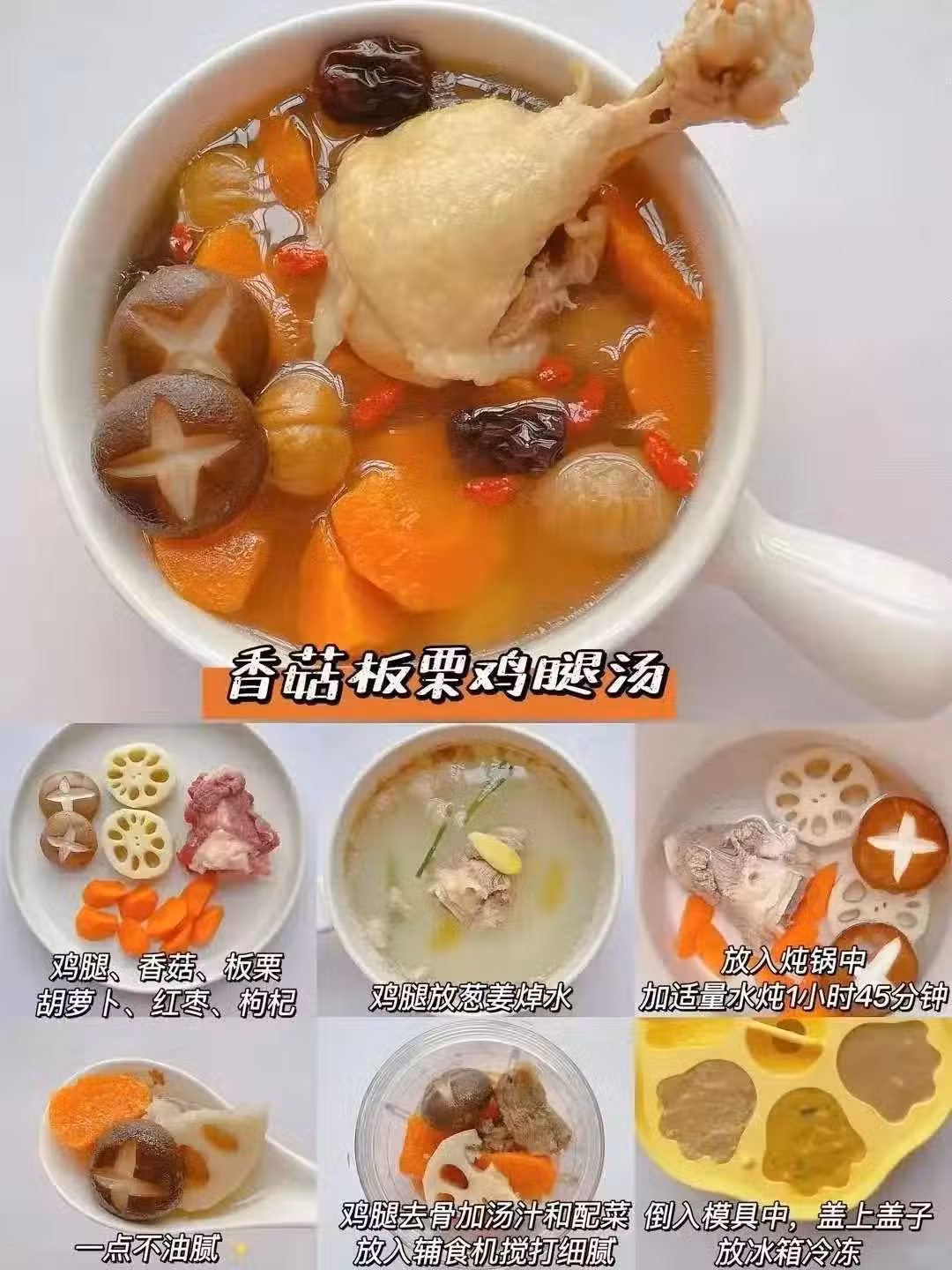 雞腿放蔥姜焯水去腥,去骨後與香菇、板栗、胡蘿蔔、紅棗、枸杞一起放入燉鍋。