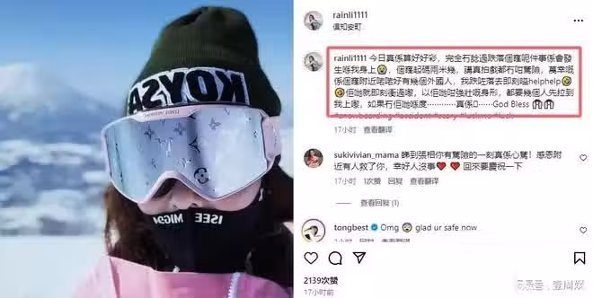 李彩樺日本滑雪遭遇意外,跌入兩米雪洞大喊救命,被人合力救起