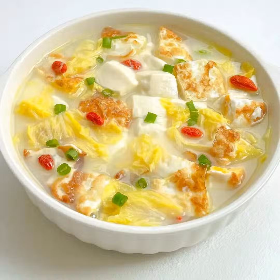 白菜半棵、嫩豆腐1塊、雞蛋2個、蔥花1把、枸杞1把