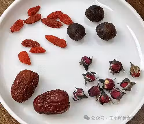 材料:枸杞10粒、桂圓3顆(去殼去核)、紅棗2個(去核)、玫瑰花2克。