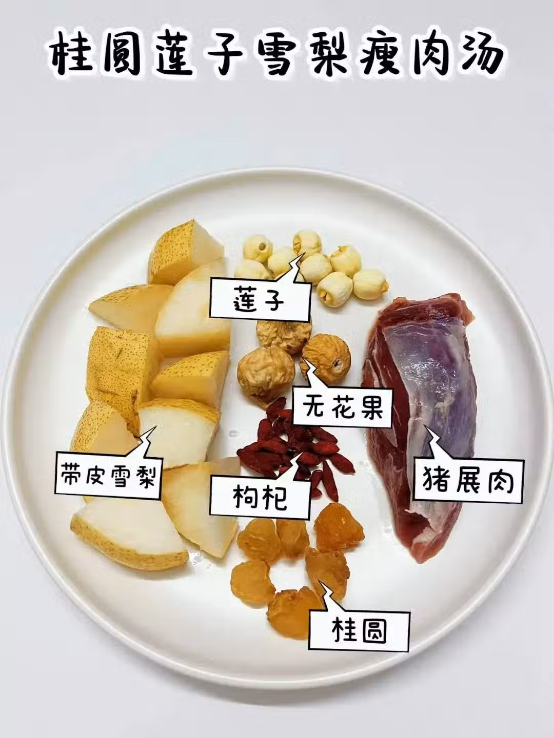 食材準備:雪梨➕瘦肉➕蓮子➕桂圓➕無花果➕枸杞