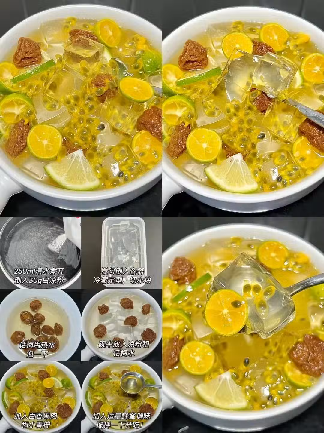 3️⃣冷藏好的白涼粉切小塊十百香果十話梅和水十小青檸十蜂蜜,拌勻開吃。