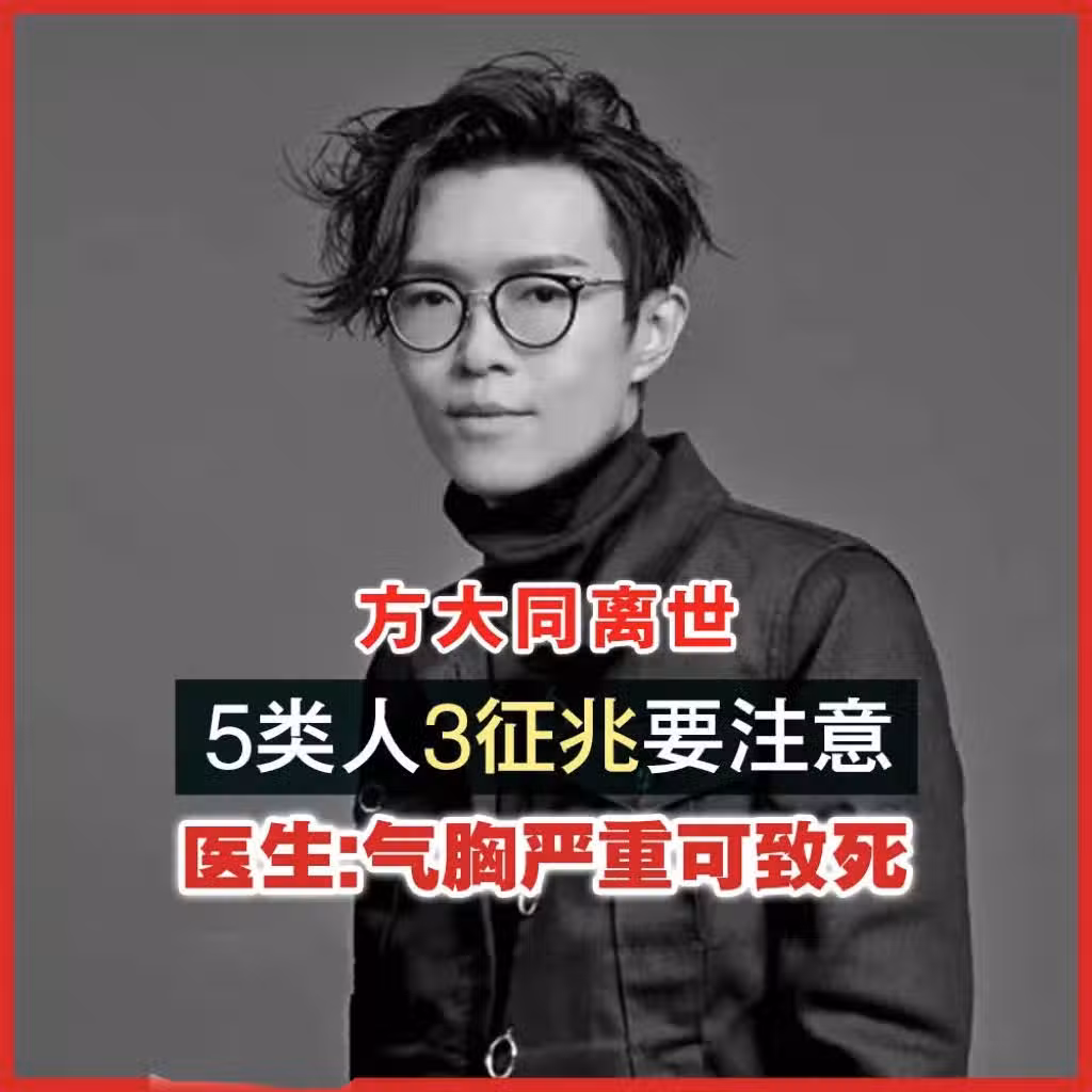 (台灣1日訊)金曲歌王方大同離世,得年41歲。據了解,方大同過去曾有氣胸症狀,甚至一度在2022年推出單曲後消失兩年;對此,不少醫生就曾提醒,有5類人或出現3徵兆者,要多注意氣胸,嚴重時可能導致死亡。