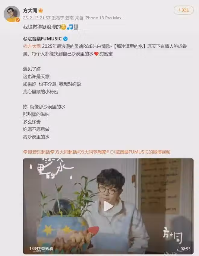 今年2月13日,方大同發布最後一條微博動態,為情人節新歌《那沙漠裡的水》做宣傳。