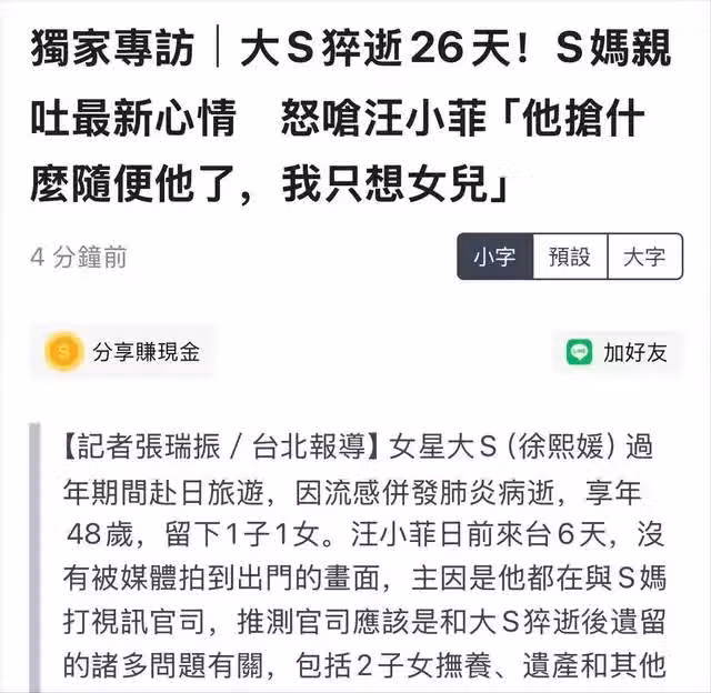 短短一兩周時間,S媽就決定放棄一切,不再處理大S的遺產與債務問題。