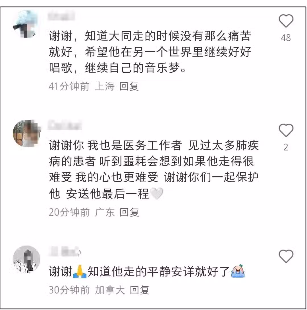 不少粉絲看到醫務人員分享的方大同離世狀態,紛紛表示感謝,稱知道方大同走得不痛苦就好。有同是醫務人員的粉絲稱肺疾病的患者大多都遭遇了比較嚴重的痛苦,會讓人擔心方大同的遭遇,看到方大同的最後一程安詳就好。