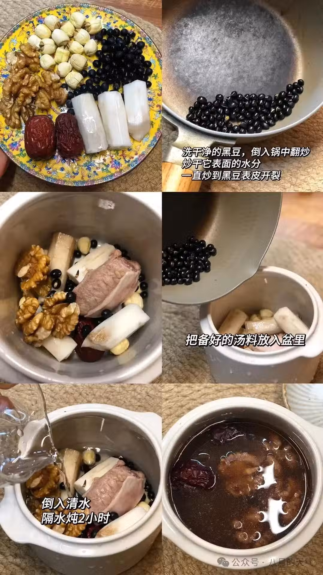 黑豆洗凈,放入鍋中小火翻炒,炒干水分,炒到表皮開裂;豬骨焯水;