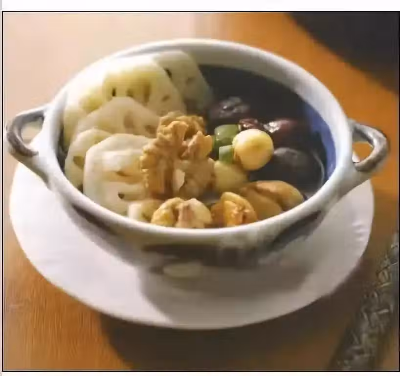 材料:核桃2兩,蓮藕1斤,蓮子2兩,栗子8兩,陳皮1片,紅棗10粒