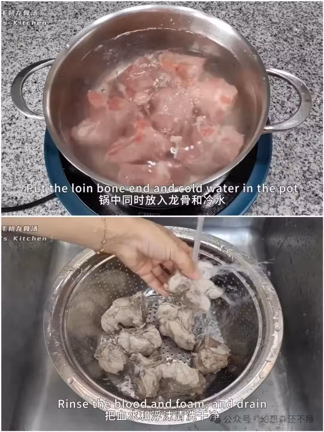 1. 龍骨焯水,把血水和浮沫清洗乾淨後再次把龍骨放入砂鍋中。