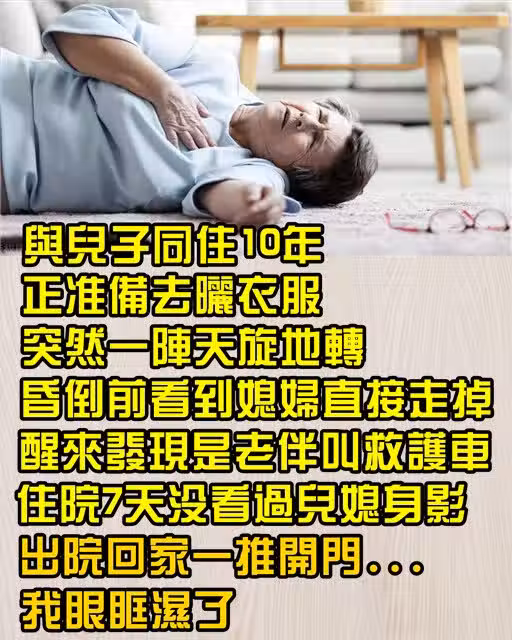 與兒子同住10年!正準備去曬衣服,突然一陣天旋地轉,昏倒前看到媳婦直接走掉,醒來發現是老伴叫救護車,住院7天沒看過兒媳身影,出院回家一推開門 我眼眶濕了 …