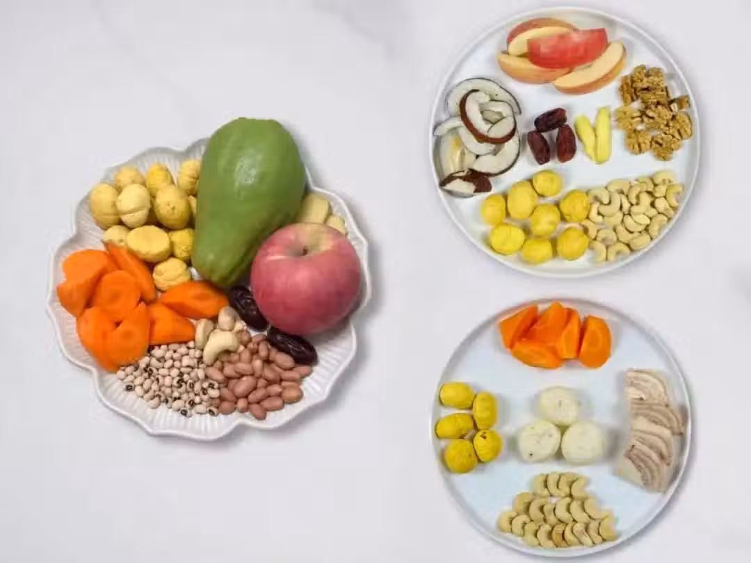 佛手瓜1個、蘋果1個、胡蘿蔔1根、板栗150克,腰果20克、花生20克、眉豆20克、椰棗2個、鹽適量、薑片適量