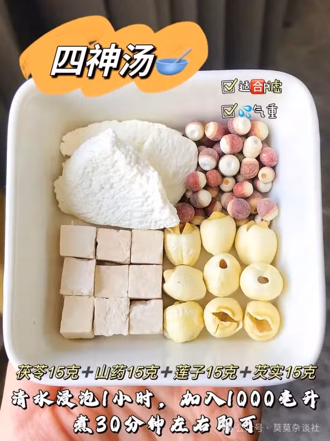 功效: 這道 「四神湯」 在台灣很受歡迎,專門用來 健脾補氣、改善脾胃虛弱,長期喝的人,腸胃變好,氣血也更足!