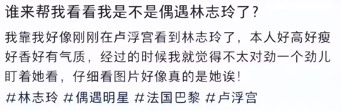 網友稱自己好像是看到了林志玲,但又不太確定,反應過來之後發現她好香好有氣質,忍不住一個勁的盯著她仔細看,本人又高又瘦像模特。