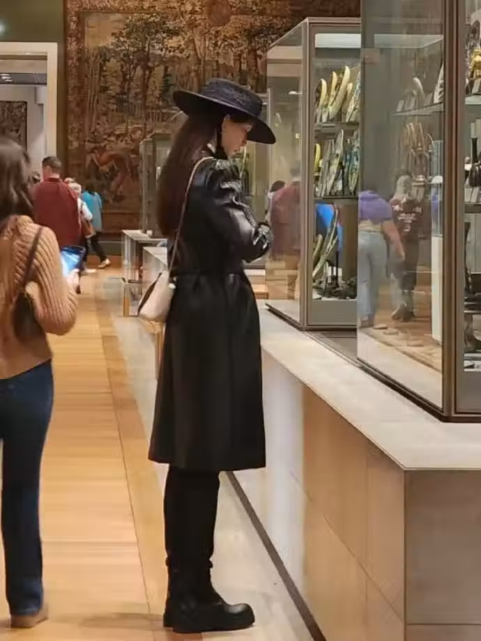 法國羅浮宮偶遇林志玲,穿長款黑皮衣又高又瘦,像模特一樣好漂亮