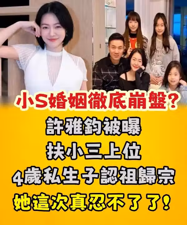 「小S的婚姻危機再次引爆熱搜!近日,有爆料稱許雅鈞已鐵了心要離婚,不僅要將4歲的私生子認祖歸宗,還計劃扶正小三。