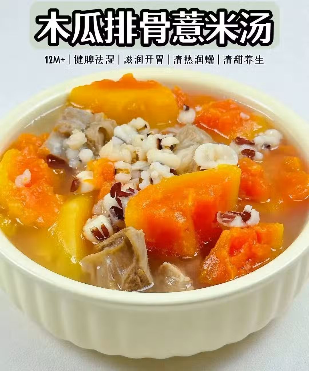 給大家推薦這木瓜排骨薏米芡實湯,這湯可以祛濕又滋潤,太好喝啦!適合全家人喝,清甜爽口,又開胃木瓜里的酵素還可以促進新陳代謝,春天口熱食欲不振特別適合煲這款湯,木瓜中有大量的維生素C和胺基酸,還可以美容養顏、滋潤肌膚,增強免疫力、促進皮膚健康、保護視力等。薏米是「祛濕高手」可以利水消腫、健脾祛濕,芡實有補脾益胃。