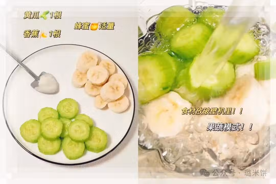 把黃瓜、香蕉、蜂蜜一起放進破壁機里,倒水,選果蔬模即可。