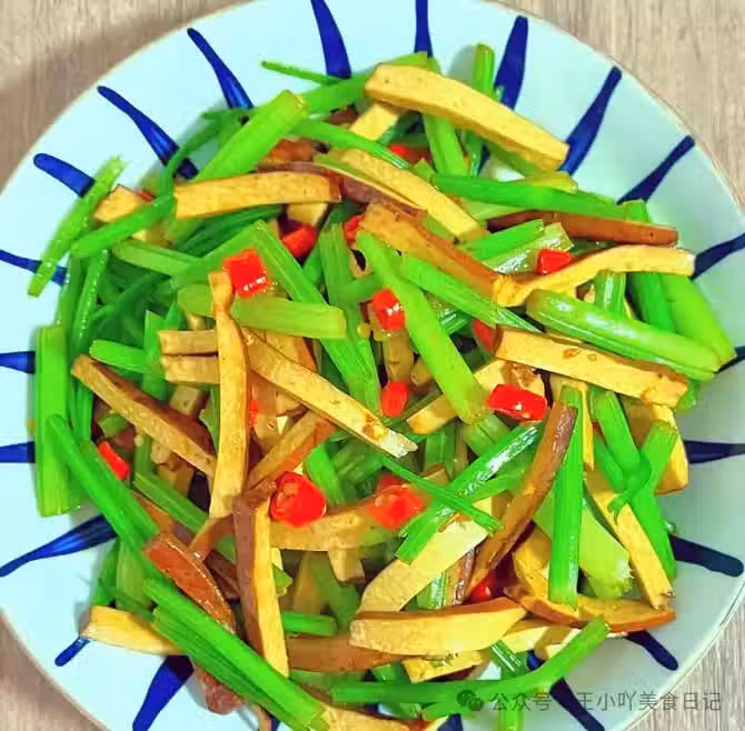 準備食材:芹菜去除葉子和筋皮,切成小細條。豆乾切成同等大小的條。