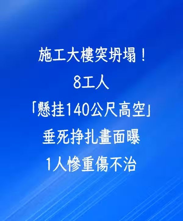 快訊/施工大樓突坍塌 8工人「懸掛140米高空」垂死掙扎畫面曝 1人慘重傷不治