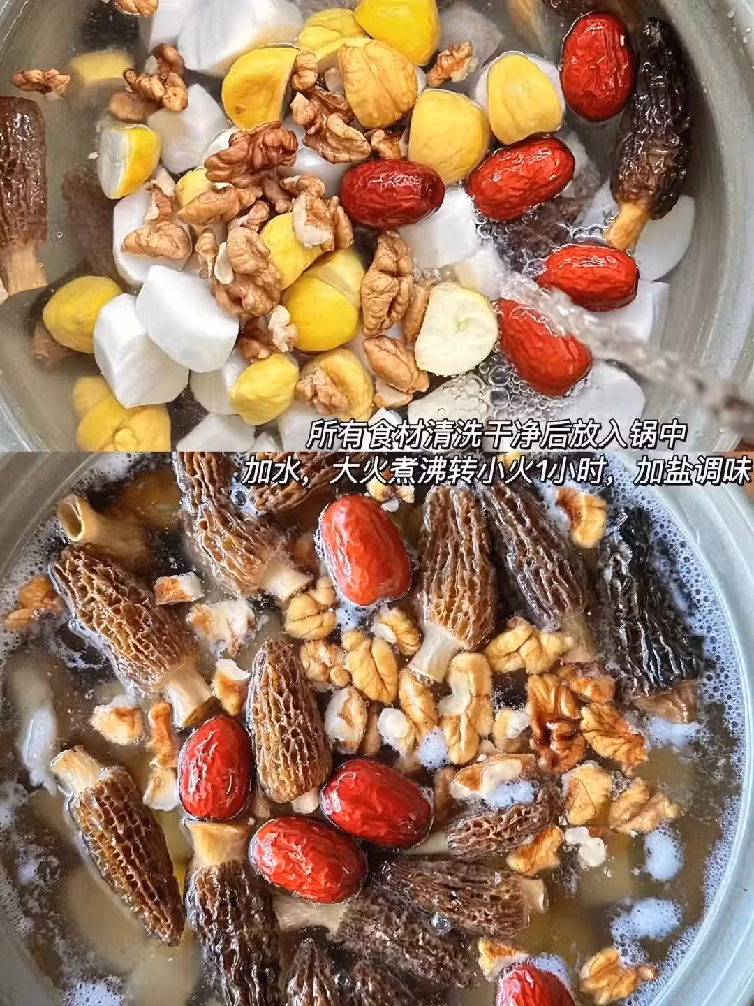 山藥入五臟,板栗補腎氣,核桃是補腎陽,枸杞則是補腎陰的,紅棗補中益氣,羊肚菌健脾養胃,擔心不好消化的可以加一片理氣的陳皮。