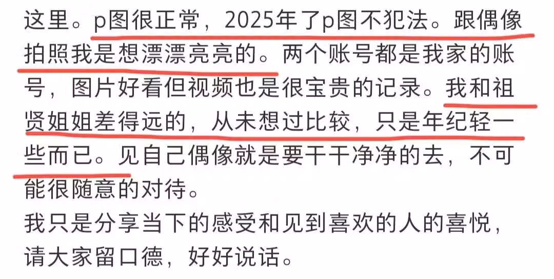 面對一系列質疑,網紅髮文回應,她確實P圖了,但P圖又不犯法。而且她從沒想過比較,自知和王祖賢差得遠,只是自己年輕一點。